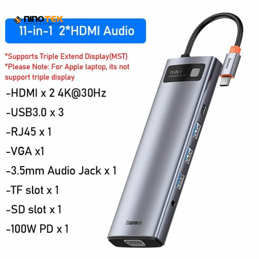 • 11 in 1: HDMI*2(4K30Hz), VGA, USB3.0*3, RJ-45, SD, TF, Audio Aux 3.5mm, Type C (PD100W)